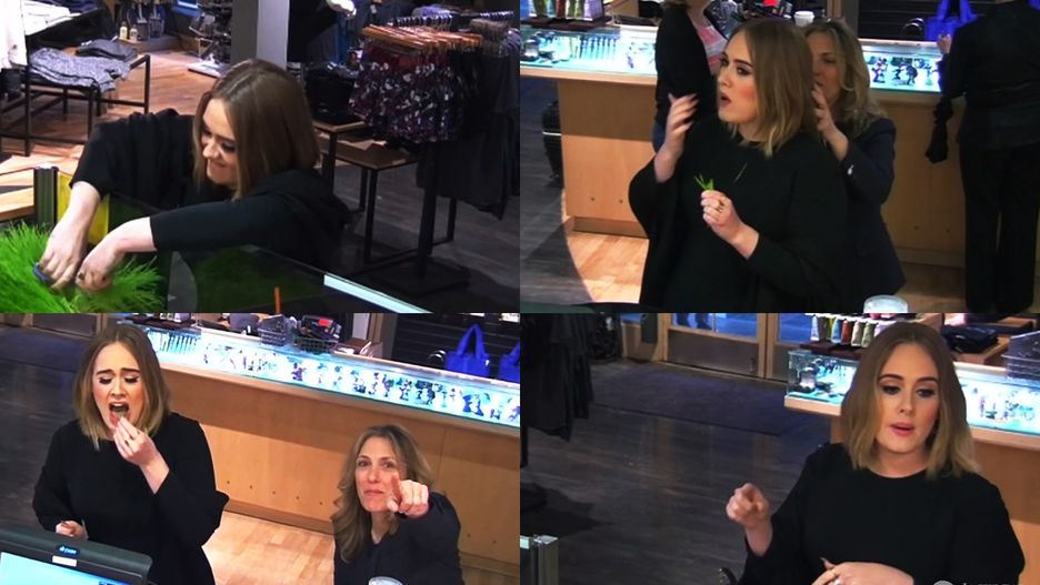 To nie koniec wrażeń, ponieważ Adele wyciągnęła nożyczki i zaczęła ścinać sobie trawę ze stojących we wnętrzu doniczek, mówiąc: