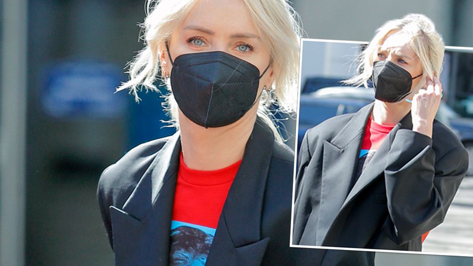 Stylizacja, którą wybrała w niedzielę, a w której została sfotografowana przed studiem Dzień Dobry TVN, zbudowana była wokół cudnej obszernej marynarki w stalowym kolorze, którą na plecach zdobił czerwony symbol anarchii.