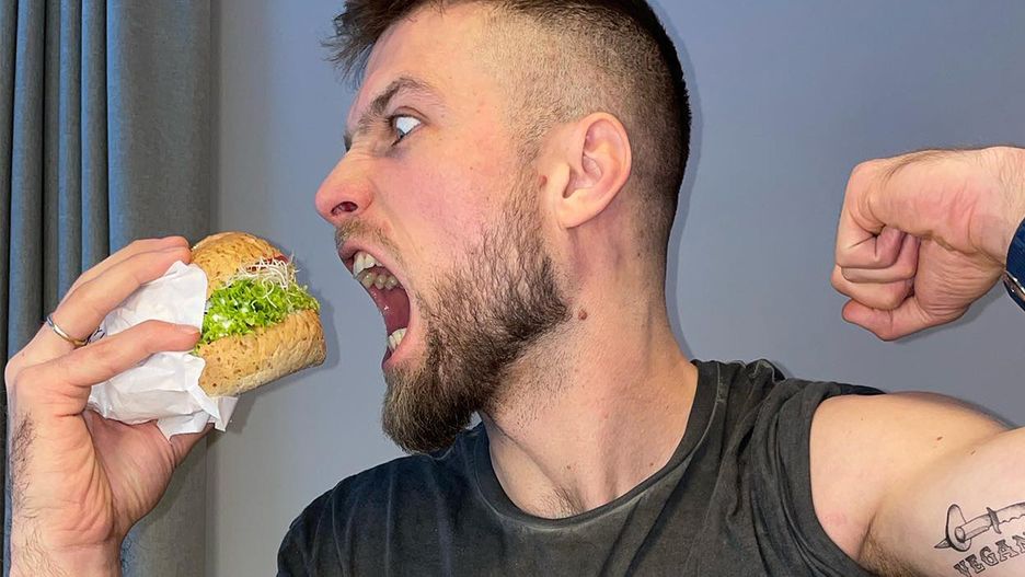Na dowód wrzucił zdjęcie, na którym zajada się burgerem wypełnionym po brzegi kiełkami i sałatą. Napiął też biceps, by udowodnić, że nie brakuje mu siły.