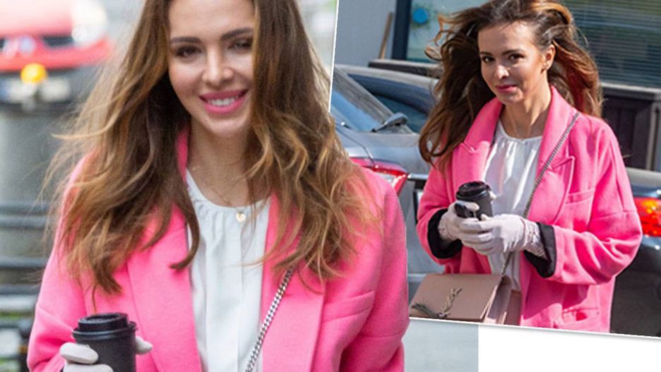 Przed studiem została sfotografowana w narzuconym na całość ciemnoróżowym płaszczyku. Pięknie ożywiał stonowane części garderoby. Do tego Ania wybrała torebkę YCL. I tu nie zabrakło niezbędnych rękawiczek ochronnych, natomiast Wendzikowska nie użyła maski.