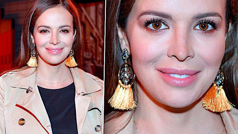Swoją stylizację dopełniła czarną, poręczną torebką i delikatnym makijażem, a stonowane kolory rozjaśniła rzucającymi się w oczy złotymi kolczykami z pomarańczowymi wachlarzami. Włosy zaczesała do tyłu i pozostawiła rozpuszczone.