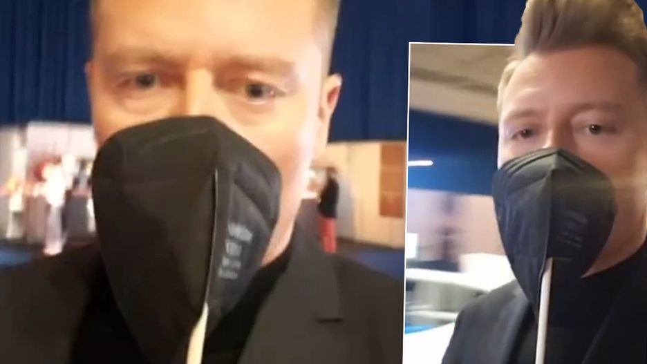 Eurowizja 2021. Rafał Brzozowski na chwilę przed występem wspomaga się specjalną maską. Za kulisami jest bardzo poważnie