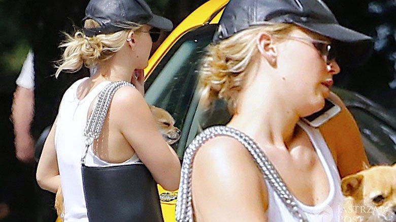 Jennifer ukryta za dużymi przeciwsłonecznymi okularami i pod czapką z daszkiem, ubrana w zwykłe czarne dżinsy i biały top bez rękawów, zupełnie nie przypominała gwiazdy filmowej jaką znamy ze ścianek i premier. Jennifer towarzyszył jej ulubieniec - piesek Pipi.