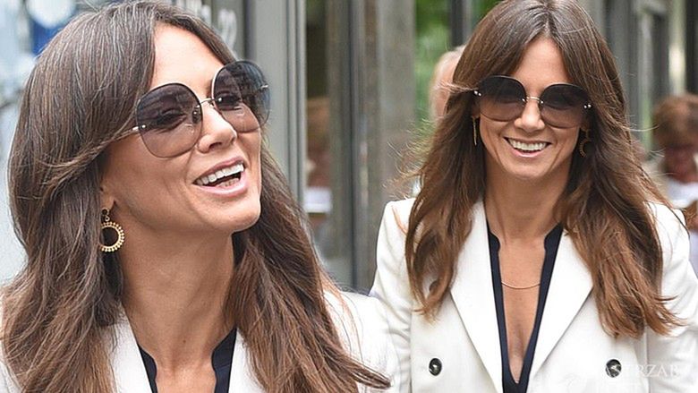 Szczęśliwą dziennikarkę mogliśmy zobaczyć w eleganckim, ale bardzo swobodnym wydaniu. Tym razem postawiła na biel, która dominuje w najnowszym sezonie. Białe spodnie i piękny biały płaszcz zostały przełamane granatową bluzką i butami.
