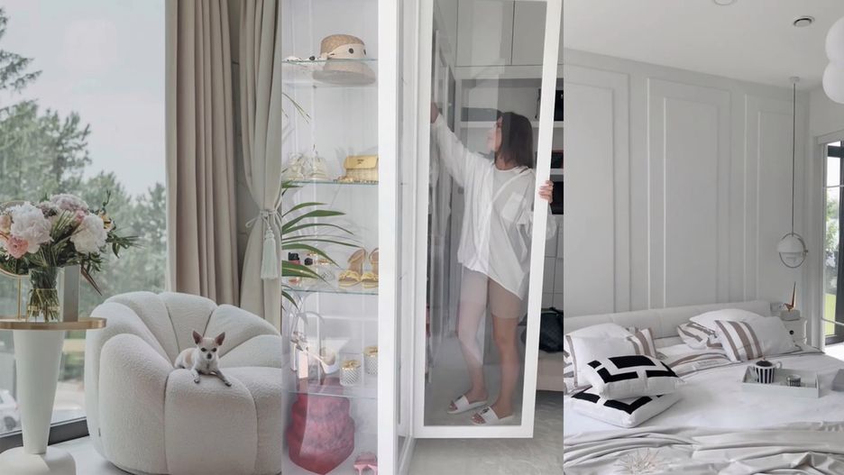 Wszystko jest urządzone w białym kolorze. W pomieszczeniu, w którym nie brakuje sporych okien, znalazło się wielkie łóżko, stoliki nocne, fotel, obrazy, a wszystko to w bieli. Za przeszkloną ścianą usytuowana jest garderoba i osobne miejsce na kolekcję butów. Nie zabrakło też roślin. Pod postem pojawiło się sporo zachwytów.