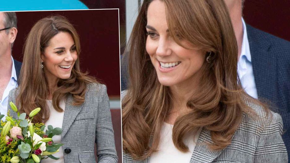 Do spodni w jesiennym kolorze żona księcia William'a dobrała biały, prosty top. Jasny kolor dodał świeżości i młodzieńczego charakteru całemu zestawowi. Nutą ekstrawagancji był szary, kraciasty żakiet z grubego materiału - taki sam jest do zdobycia w Smythe. Jego ponadczasowy fason i mocno taliowana konstrukcja uwydatniły piękną sylwetkę Kate.