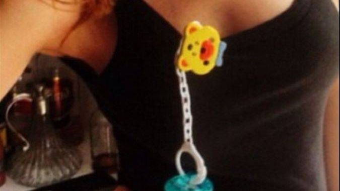 Teraz z kolei gwiazda zaprezentowała nową biżuterię, czyli smoczek przypięty klamerką do bluzki.