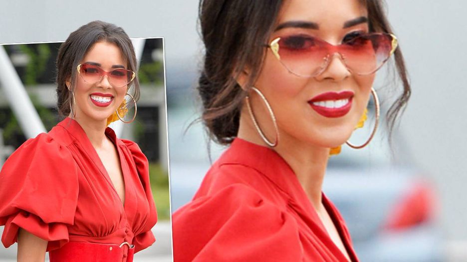 Kokietowała fotoreporterów, ubrana w czerwoną suknię, w której wyglądała niczym zmysłowa tancerka flamenco. Dobrała do niej buty na obcasie, fioletową torebkę i przeciwsłoneczne okulary. Prezenterka postawiła na upięte włosy, w które wplotła kwiat. Usta podkreśliła pomadką w intensywnym kolorze.