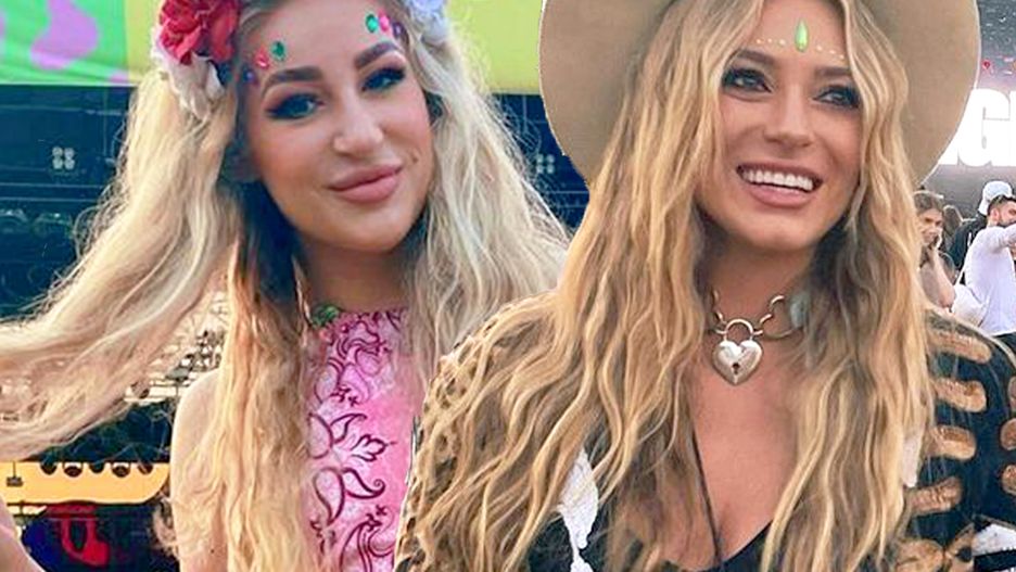 Madzia Wójcik z Marceliną Zawadzką bawią się na festiwalu. Stylizacje piękne, tylko ten napis w tle… Co za niefart