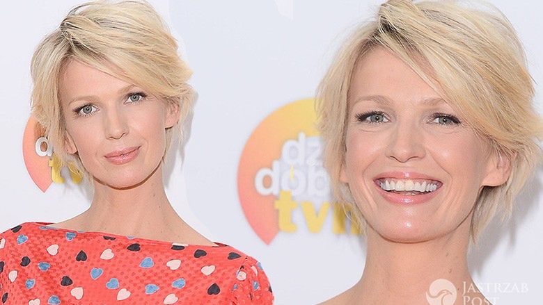 Pomarańczową bluzkę z motywem serc połączyła z szerokimi spodniami w burgundowym odcieniu i klasycznymi szpilkami. Tego typu zestawienie barw jest ryzykowne, jednak w tym przypadku się opłaciło. Cały look prezentuje się interesująco. Ponadto prezenterka postawiła na delikatny makijaż i lekko rozwiane włosy.