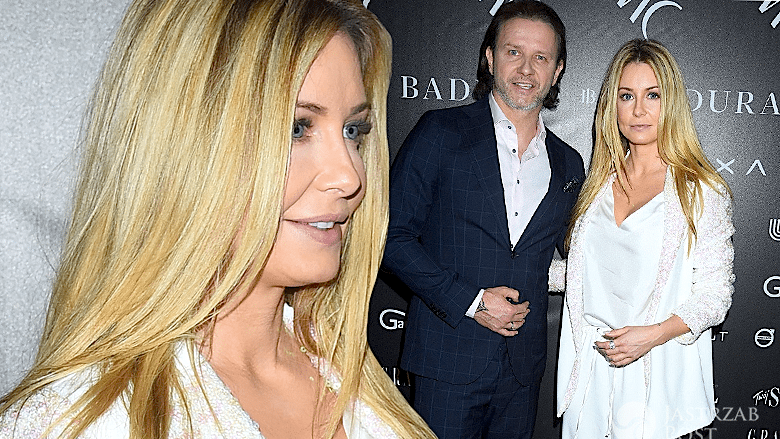 Biały garnitur, top i spodnie palazzo wspaniale prezentowały się na prowadzącej Projekt Lady. Jedynie buty były w innym, srebrnym kolorze. Niemniej elegancki na pokazie MMC był jej małżonek - Radosław Majdan.