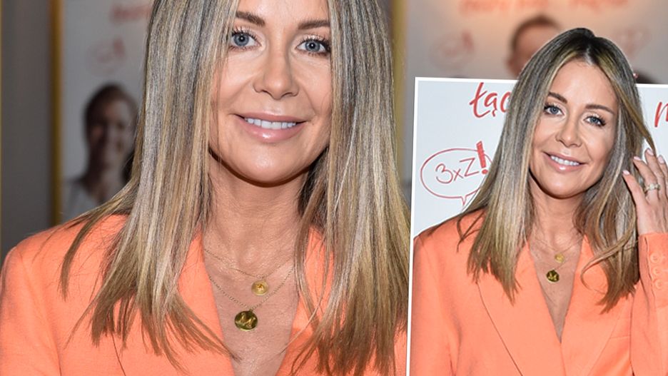 Małgorzata Rozenek w brzoskwiniowej marynarce i w spodniach, których prawie nie widać. Sporo ryzykowała taką stylizacją