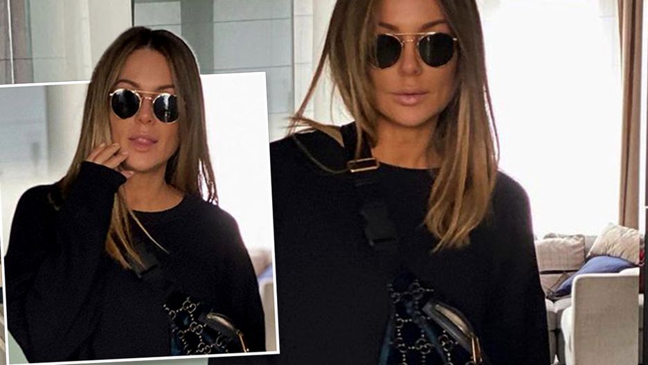 Wybrała czarny, wygodny dres z luźniejszą górą. Przez pierś przewiesiła ciekawą torebkę - nerkę, założyła przeciwsłoneczne okulary i buty, które wyglądają na niezwykle wygodne.