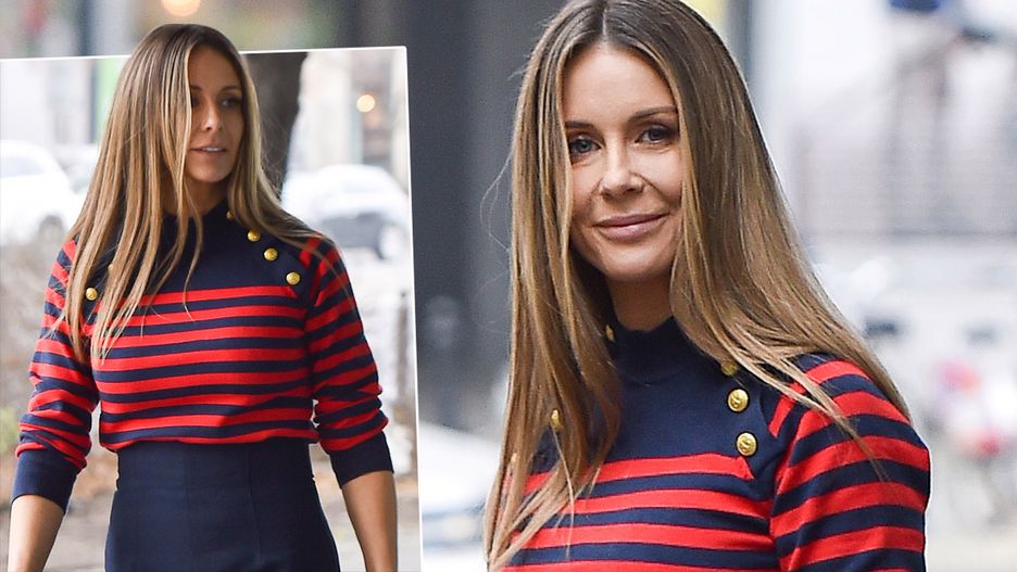 My oczywiście przyjrzeliśmy się jej stylizacji. Tego dnia postawiła na elegancję i klasykę. Wybrała granatowe spodnie na kant z wysokim stanem. Dobrała do nich sweterek w czerwono-granatowe paski ozdobiony złotymi guzikami. Wszystko uzupełniła wysokimi czarnymi butami na słupku.