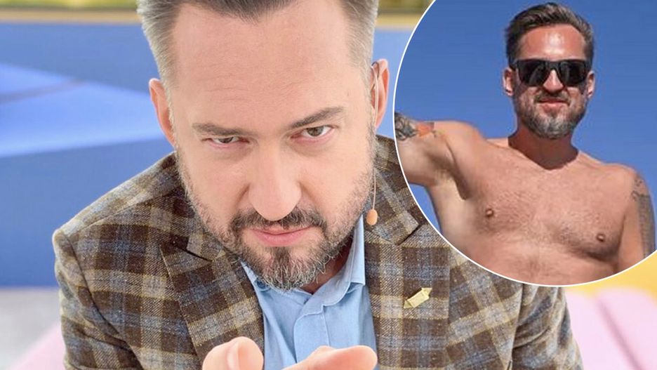 Marcin Prokop bez koszulki pokazuje umięśniony brzuch