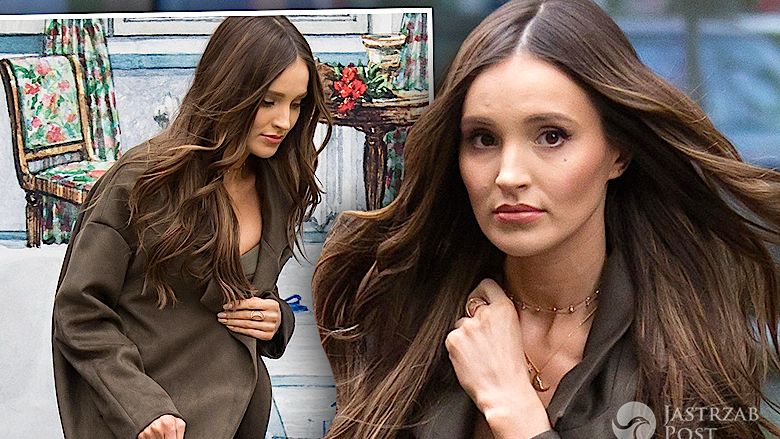 Piosenkarka miała na sobie bardzo seksowny komplet, złożony z krótkiego crop topu z dekoltem i spodni wiązanych z boku w tym samym, szarym kolorze. Ze względu na pogodę celebrytka zdecydowała się na ciepły, brązowy płaszcz, do którego dobrała beżową skórzaną torebkę. Całą stylizację uzupełniła botkami na obcasie pod kolor.