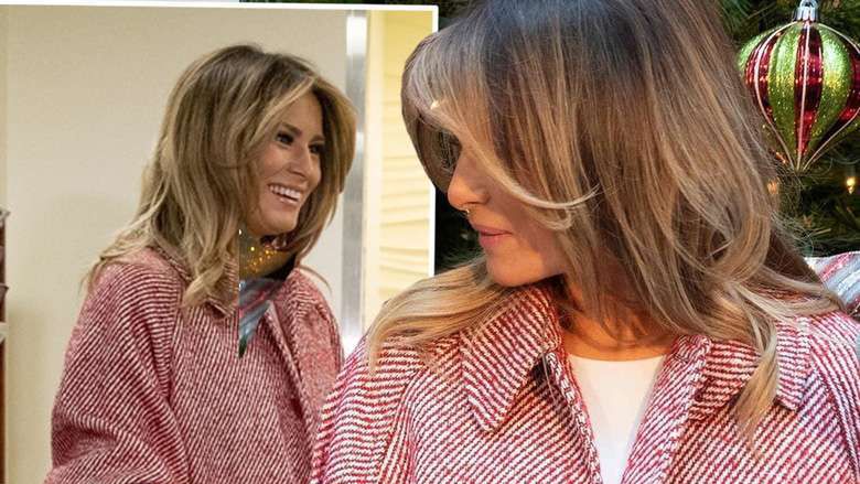 Spod ogromnego wełnianego płaszcza w czerwono-białe pasy, ozdobionego dużymi guzikami, wystawała elegancka biała sukienka, która świetnie podkreślała nogi Melanii. Niestety, ogromne wierzchnie nakrycie psuło cały efekt. Warte uwagi są za to szpilki, również w czerwono-białe pasy, które byłyby genialnym świątecznym akcentem do samej kreacji, gdyby nie przytłaczała ich reszta stylizacji.
