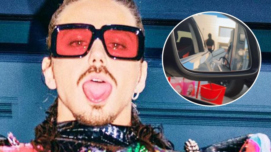 W piątek popołudniu artysta podjechał autem na stację paliw, by zatankować. Klienci obiektu musieli zwrócić uwagę na jego nietypową kreację. Miał na sobie obcisłe spodnie i top, który odsłaniał brzuch. Niemniej jednak to jego twarz najbardziej przykuwała uwagę! Nałożył na nią srebrną maseczkę. Znalazły się na niej cekiny, klejnoty i inne świecące ozdoby.