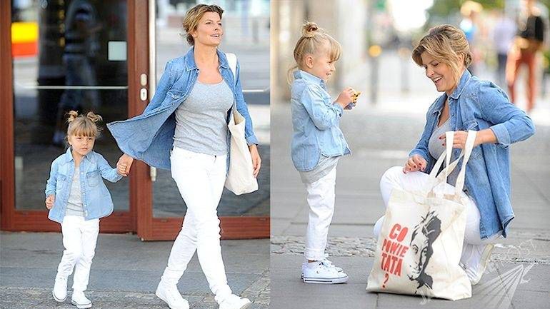 Identycznie ubrane Justynę Tomańską z córką Zosią sfotografowano przed wejściem do studia, a my zwróciliśmy uwagę na torbę Justyny ze zdjęciem Mariusza i napisem „Co powie tata?”. Zdjęcia w galerii poniżej.