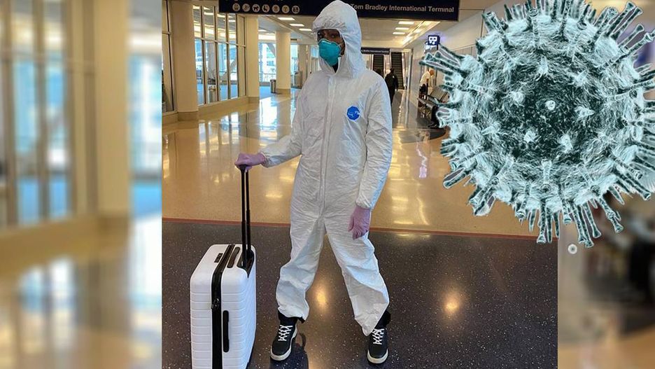 Gwiazda walczy z koronawirusem. Na lotnisku straszyła pasażerów w takim stroju