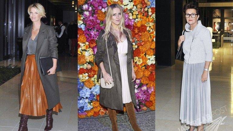 Spódnica z plisami może być - jak u Magdy Mołek - wykonana ze skóry (albo tkaniny, która ją imituje). Wystarczy dodatek kozaków na grubym słupku, żeby podjąć stylową zabawę i przenieść się w klimatyczne lata 70.