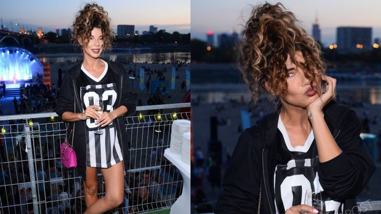 Piosenkarka dopasowała stylizację do miejsca konferencji i postawiła na sport: czarno-biała sukienka, bluza i buty od Adidasa. Całość przełamała różową torebką Valentino, która kosztuje ok. 8 tys. złotych, podkręciła włosy, które ułożyła w luźny kok. Na usta nałożyła pomadkę w bordowym odcieniu, która świetnie współgrała z lekkim makijażem.
