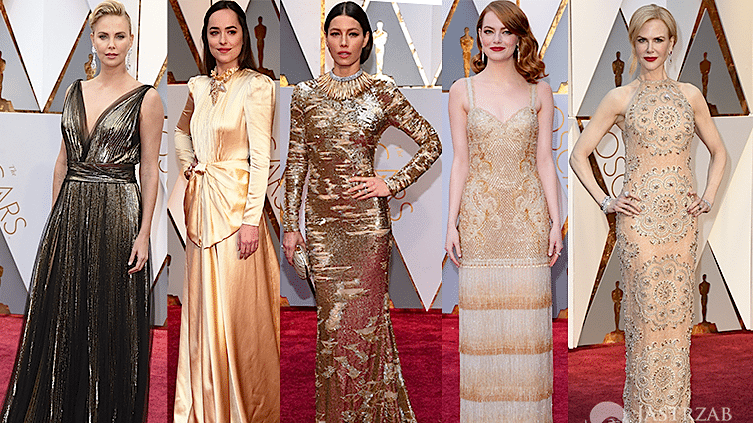 Na rozdaniu Oscarów 2017 kilka gwiazd pojawiło się w złotych kreacjach. Zaliczamy do nich m. in.: Emmę Stone, która zaprezentowała się w kreacji Givenchy Haute Couture, Dakotę Johnson w sukni Gucci, Jessicę Biel w projekcie Kaufman Franco i Nicole Kidman w kreacji Armani Prive.